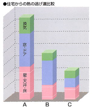 この3つの逃げ道から、どれほど熱が逃げ、断熱と窓の選択で、どう変わるかを表したのが下のグラフです。