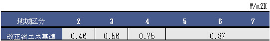天井・壁・床・開口部など住宅の全外皮から逃げる熱を全外皮面積で割算したものです。 下表は16年改正省エネルギー基準が求めるUAの限度です。きわめて甘い基準で、99年次世代省エネルギー基準の断熱仕様基準で建てた家とほとんど変わりません。「住みごこち」の良い家を求めるのならもっと断熱性能の良い家を考えるべきです。